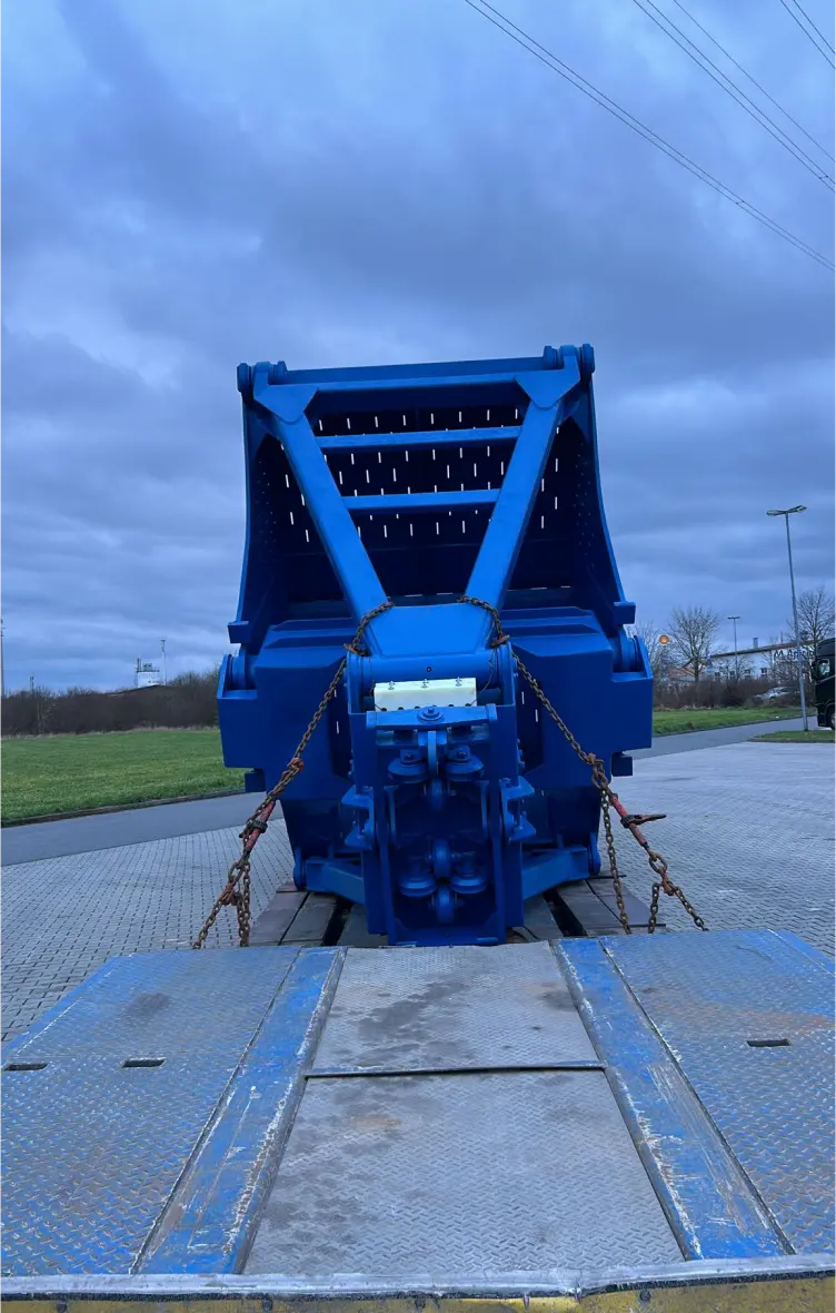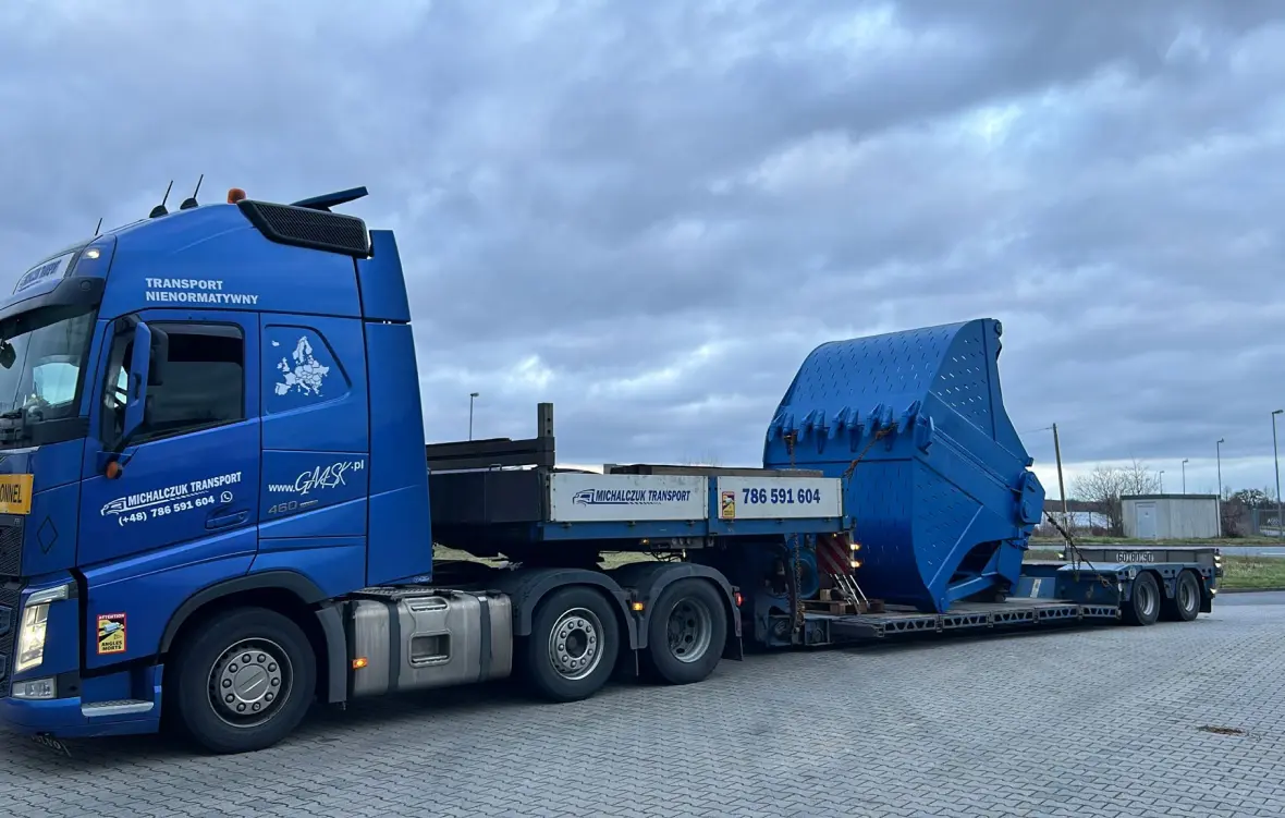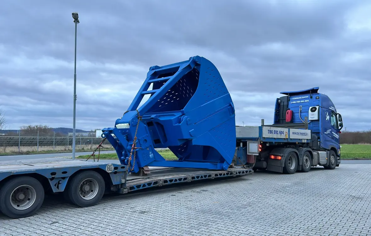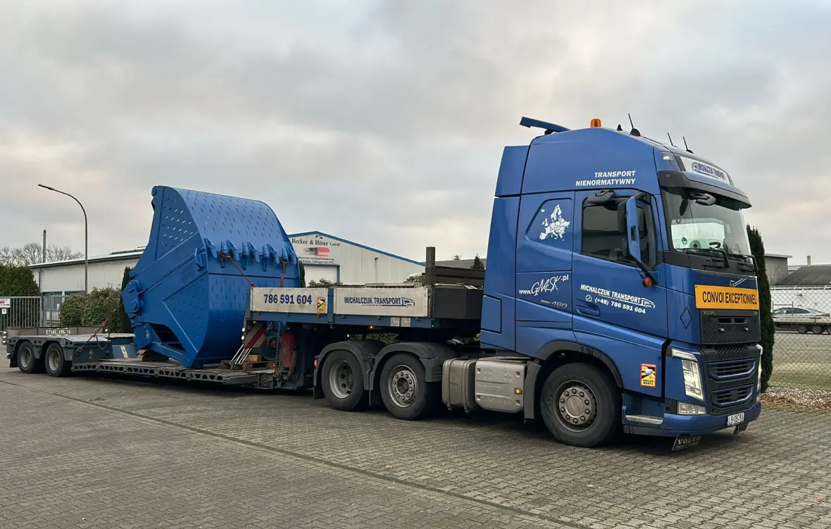 Transport elementów koparki górniczej przy użyciu naczepy tiefbett dla naszego klienta z Niemiec waga 18t wysokość 3,75m szerokość 2,60m długość 5m transport ponadnormatywny, niestandardowy
